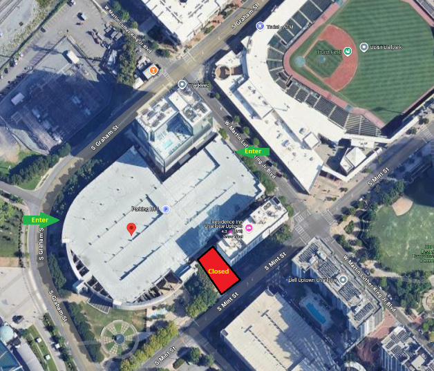 The Mint Street Entrance will be closed to all traffic due to construction. All vehicles must enter and exit on S. Graham, or MLK Blvd. (MKL Blvd entrance is directly across the street from the Ticket Office for Truist Field)