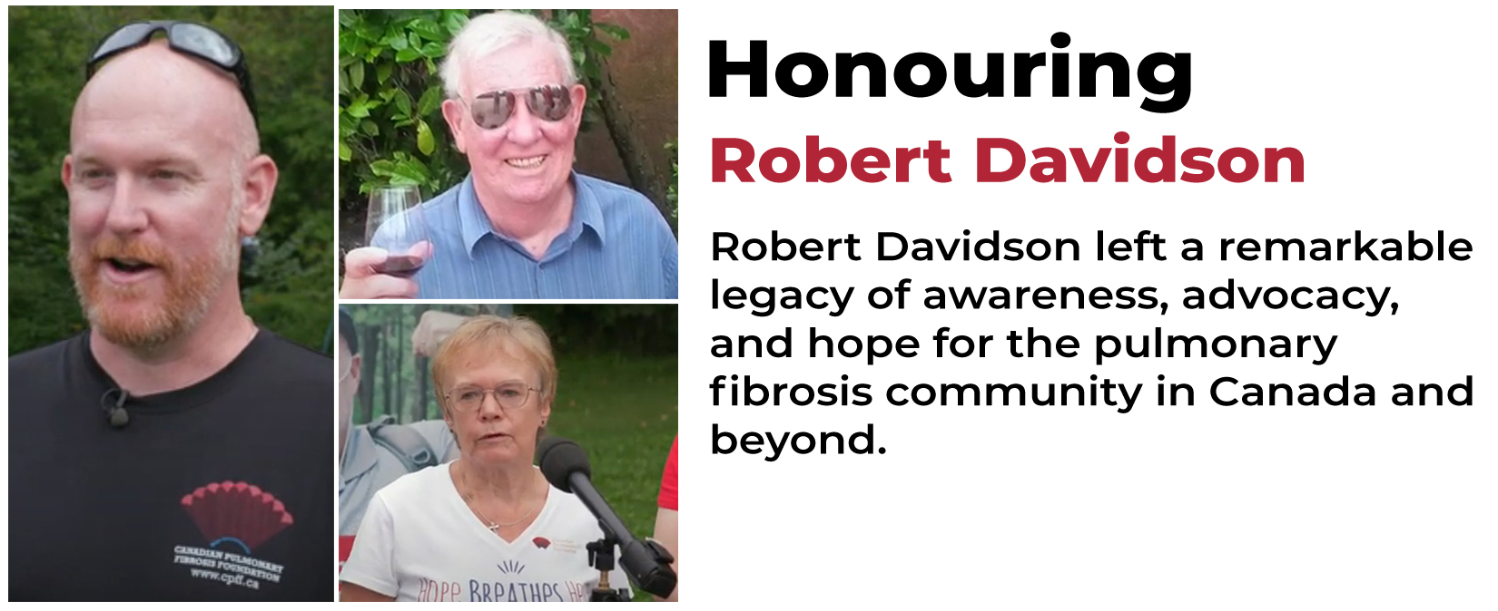 He founded the Canadian Pulmonary Fibrosis Foundation in 2009, less than two years after his own diagnosis with idiopathic pulmonary fibrosis and just months before receiving a double-lung transplant. Through his courage and compassion, Robert brought together patients, families, and healthcare professionals across the country, helping many Canadians live as fully as possible despite this devastating disease.