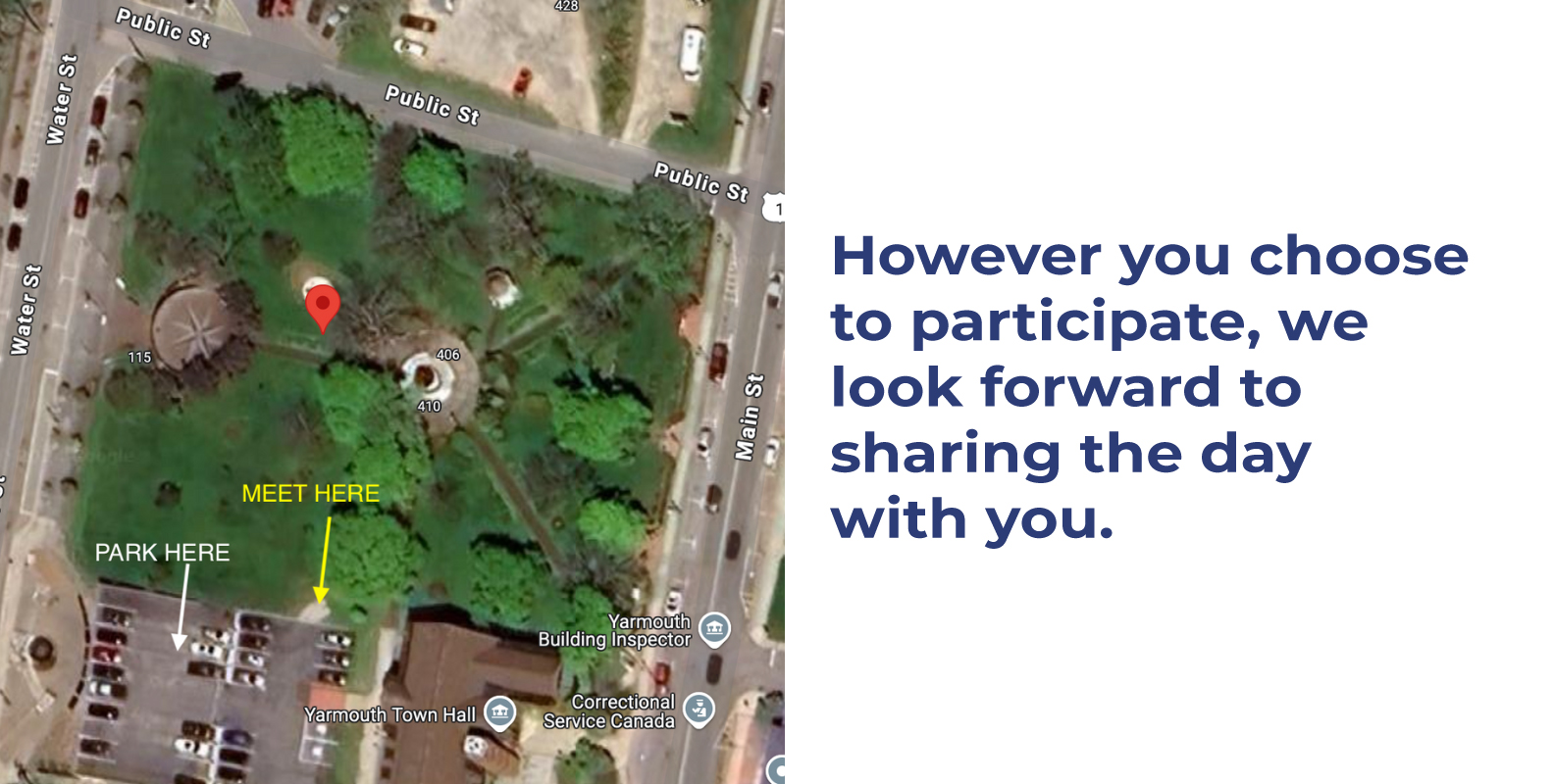 The walk will begin in Frost Park, continue along Main Street to the historic waterfront, and return to the park. The route is approximately 1.5 km per loop, and participants are welcome to: