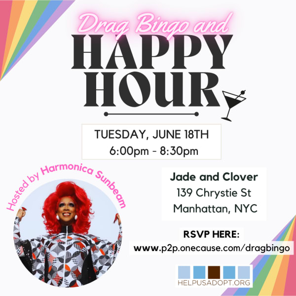 Join Helpuadopt.org in celebrating Pride Month by having a cocktail, playing bingo, and learning how you can help support LGBTQIA+ families built by adoption. Drag Bingo, hosted by comedian and queen Harmonica Sunbeam, will be a fun and fabulous night with great prizes and lots of laughs! We hope you'll join us in celebrating the LGBTQIA+ families we've helped build throughout the years.