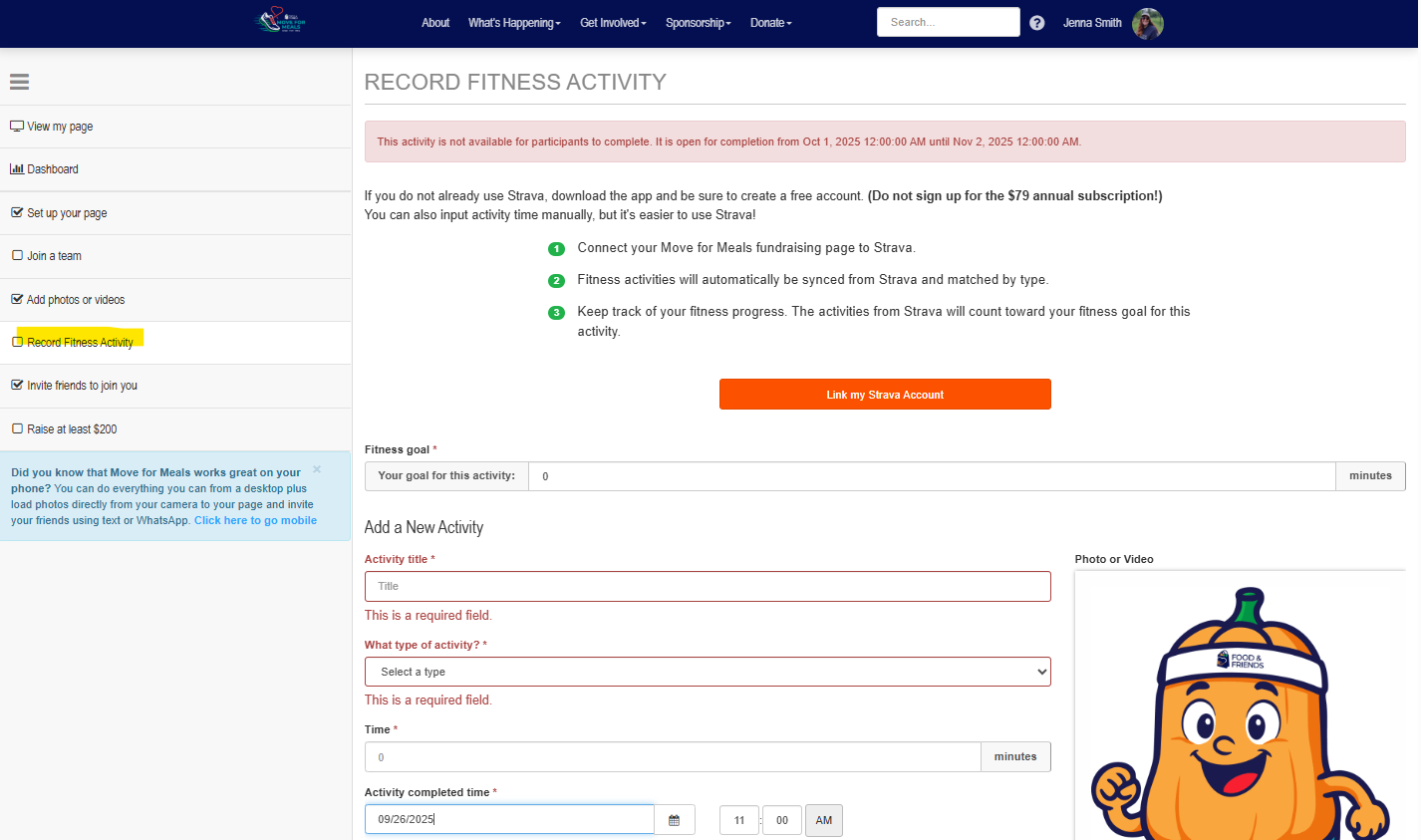 Once October 1st starts, in your participant dashboard, you will be able to access the "Record a Fitness Activity" Portal, like below. View this video to see how you can record an activity!