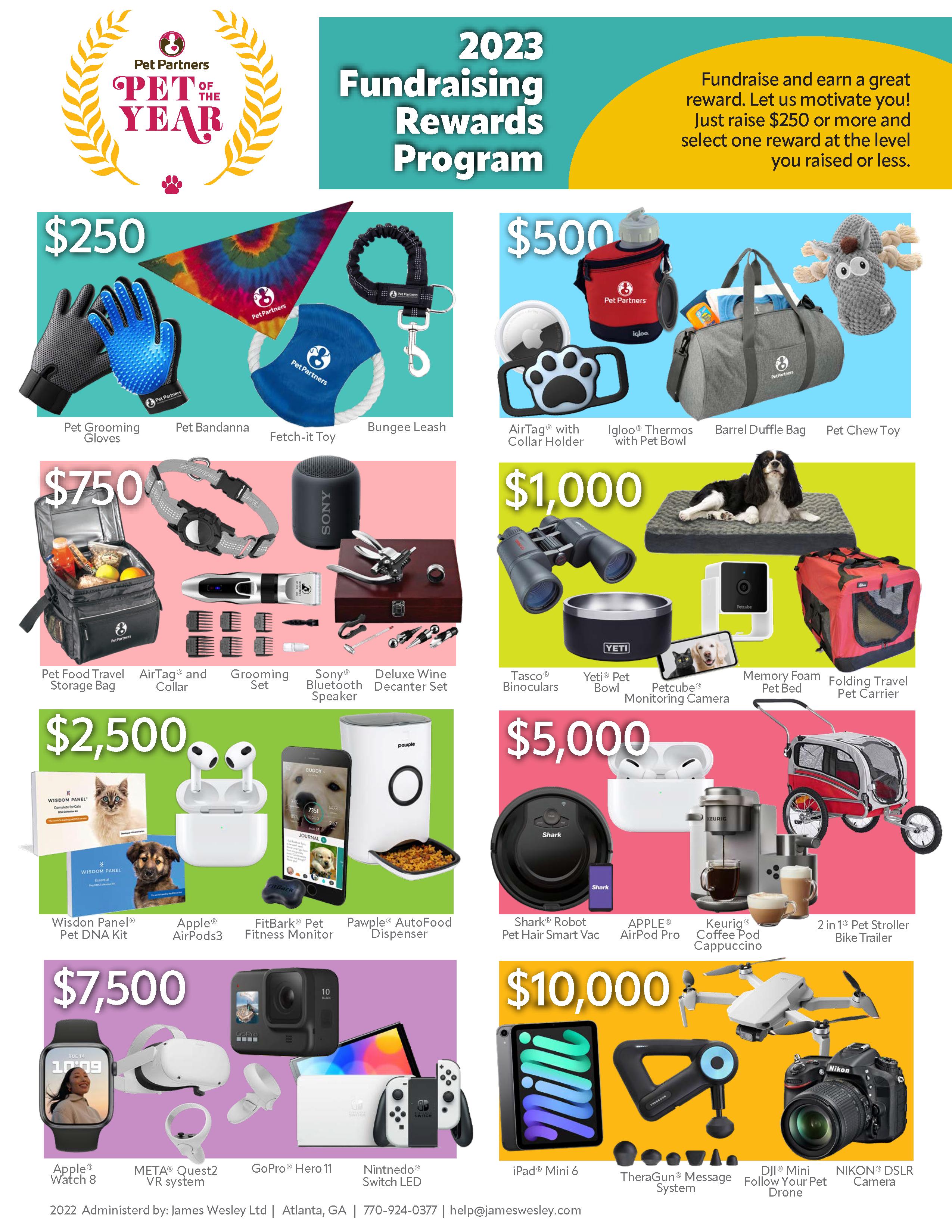 There are additional prizes for fundraising members and pet candidates at the $250 and higher levels as a thank-you for your incredible fundraising efforts.
