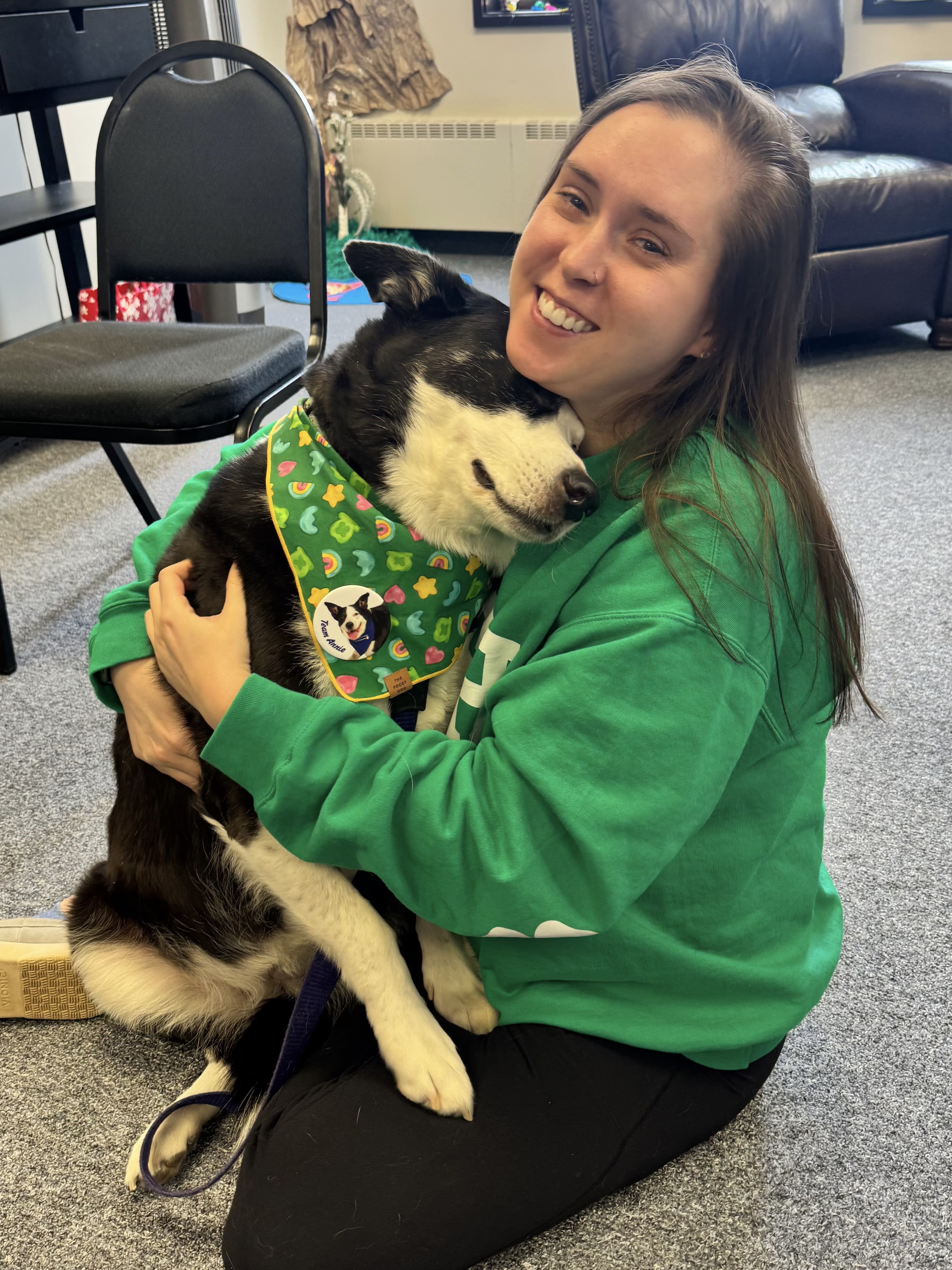 I’m Annie’s human and full-time ride to all of her volunteer shifts. Annie is a registered therapy dog who spends her time visiting counseling centers, community spaces, and hospitals, where she specializes in morale boosts, silent emotional support, and aggressively offering her belly for rubs. I’ve watched her walk into waiting rooms, cancer centers, and busy clinic days and somehow know exactly who needs her most. She has comforted nervous patients, helped staff decompress after long shifts, and accepted thousands of very professional belly rubs in the line of duty.