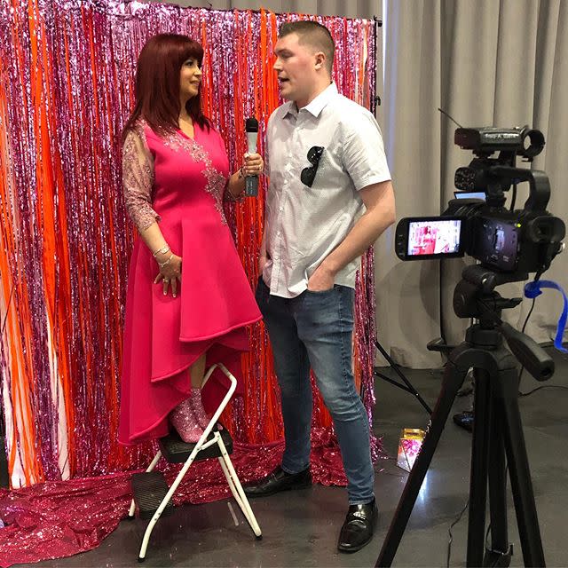 One of the highlights working the pink carpet for Shop. Sell. Strut! @shopsellstrut Season 3 was interviewing #singer and #songwriter Tommy Byrne @tommytootall_nj, who performed his viral #autism-inspired anthem, “Unstoppable” @unstoppablesong. Definitely buy the song on iTunes. As you can see, Tommy is a bit taller than I am, so we had to improvise for our interview. Thank you for creating a wonderful moment during your performance, Tommy, and thank you for supporting autism awareness. #redcarpethost #pinkcarpethost #strutforautism #host #interview #musician #guitarist #smile #5192019